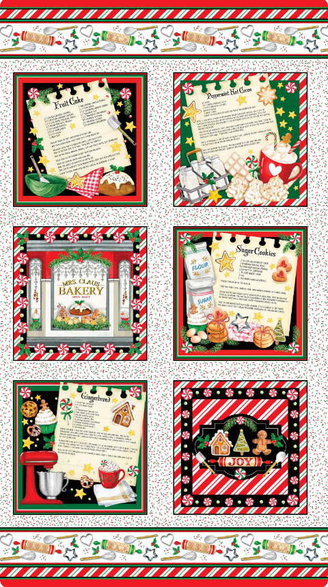 A Christmas-themed panel featuring a variety of festive patterns and designs. Candy cane stripe borders, fun decorated Gingerbread cookies, recipes, cupcakes and more! Holiday baking motifs round out the Christmas kitchen fun. Blocks are set in a white background, appropriately scattered with sprinkles. Lots of fun projects are waiting to unfold.