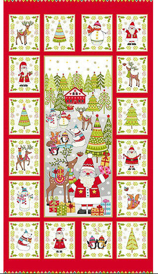 Adorable woodland creatures dressed in colorful Nordic garb, gather in town square for a spirited celebration. The center 10" by 22" block is surrounded by 16 festive Christmas 5" by 6" blocks. Each surrounding block features different friends such as snowmen, reindeer, Santa, and other fuzzy animals. The central block features a large Santa with a reindeer in a small northern village more than ready for the season's celebrations.