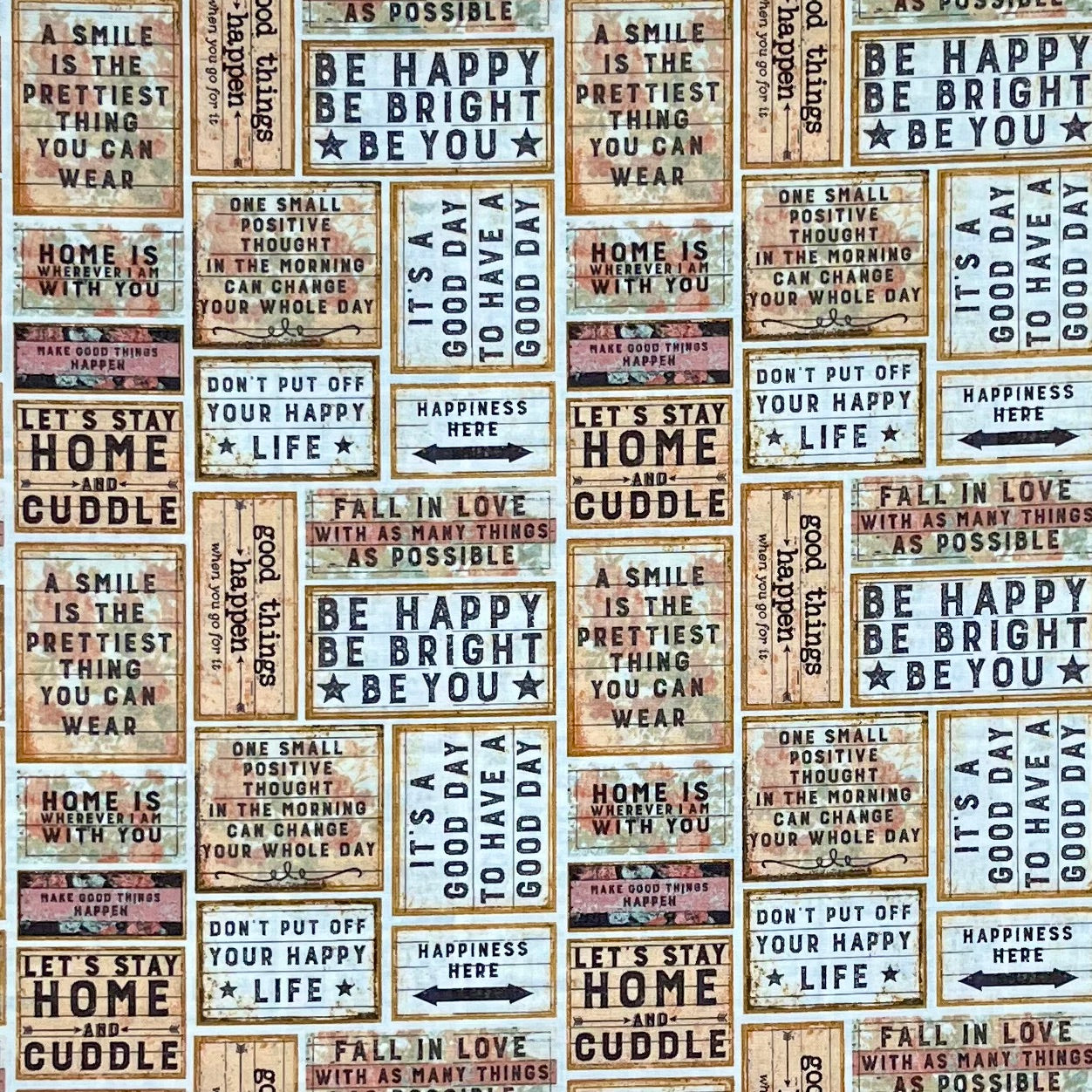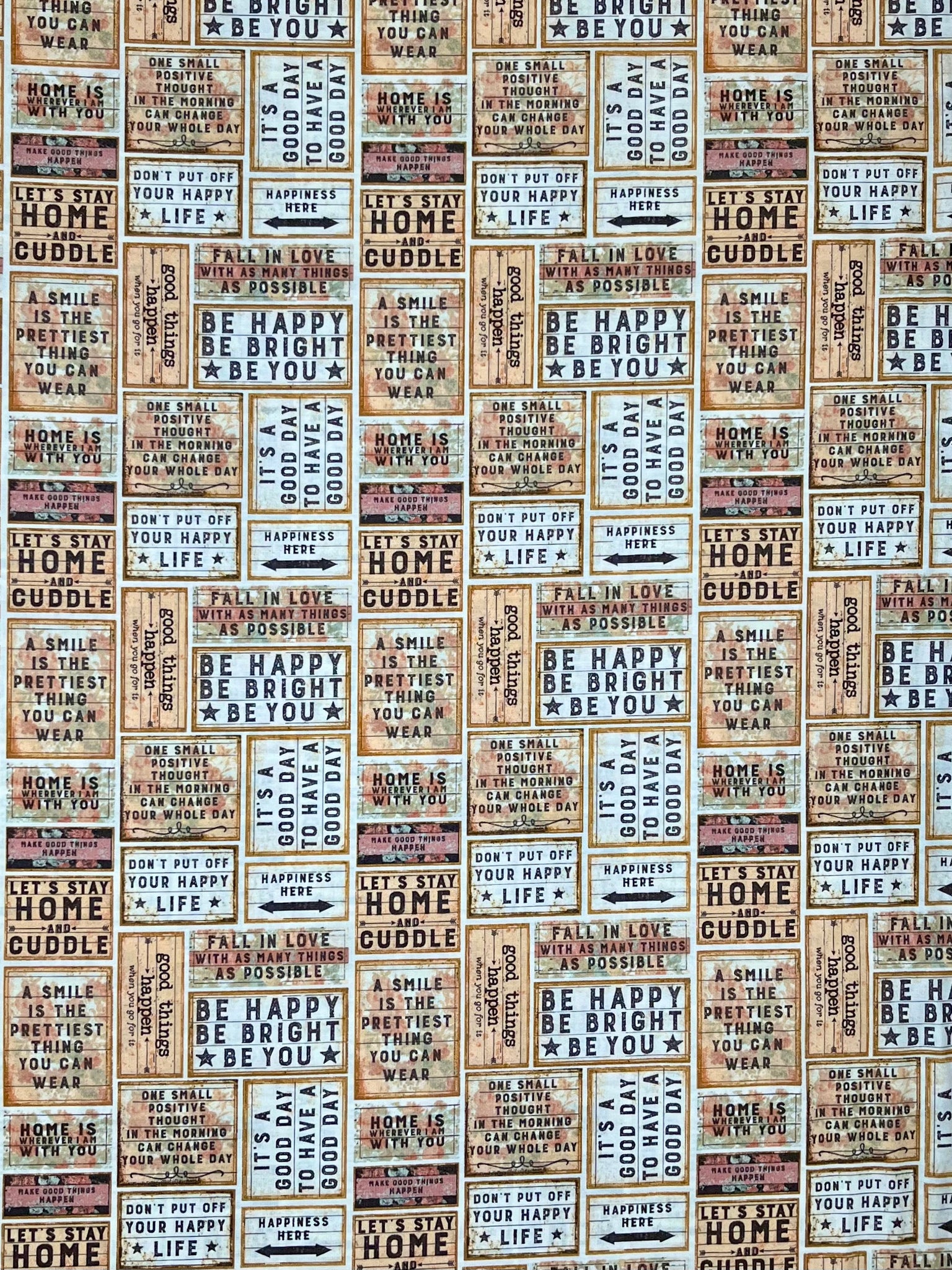 A collage of rustic wooden signs sit snug together, each showcasing inspirational quotes and positive sayings. A fabric that gives a friendly reminder to gift yourself some self compassion. Designed by Dan DiPaol for Clothworks.