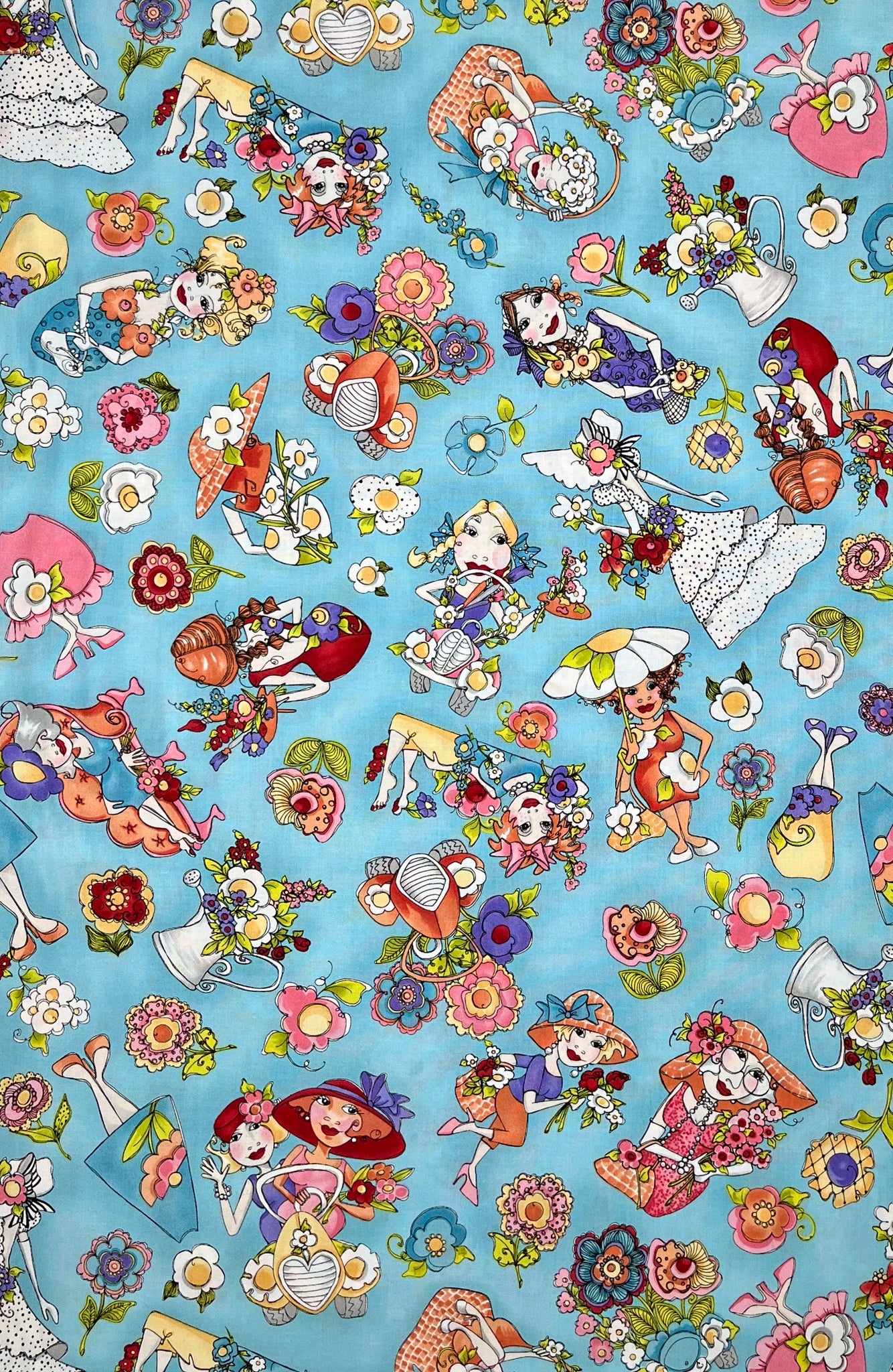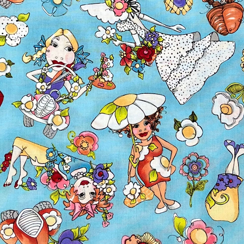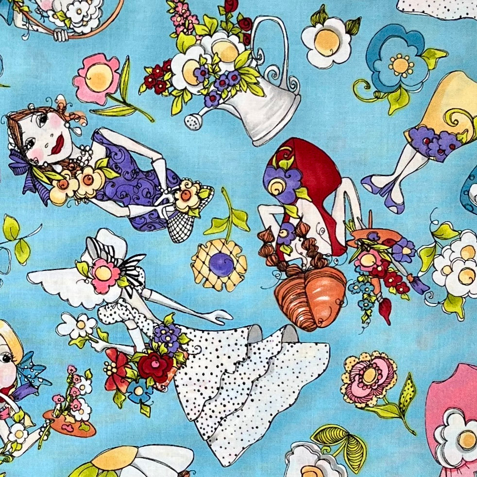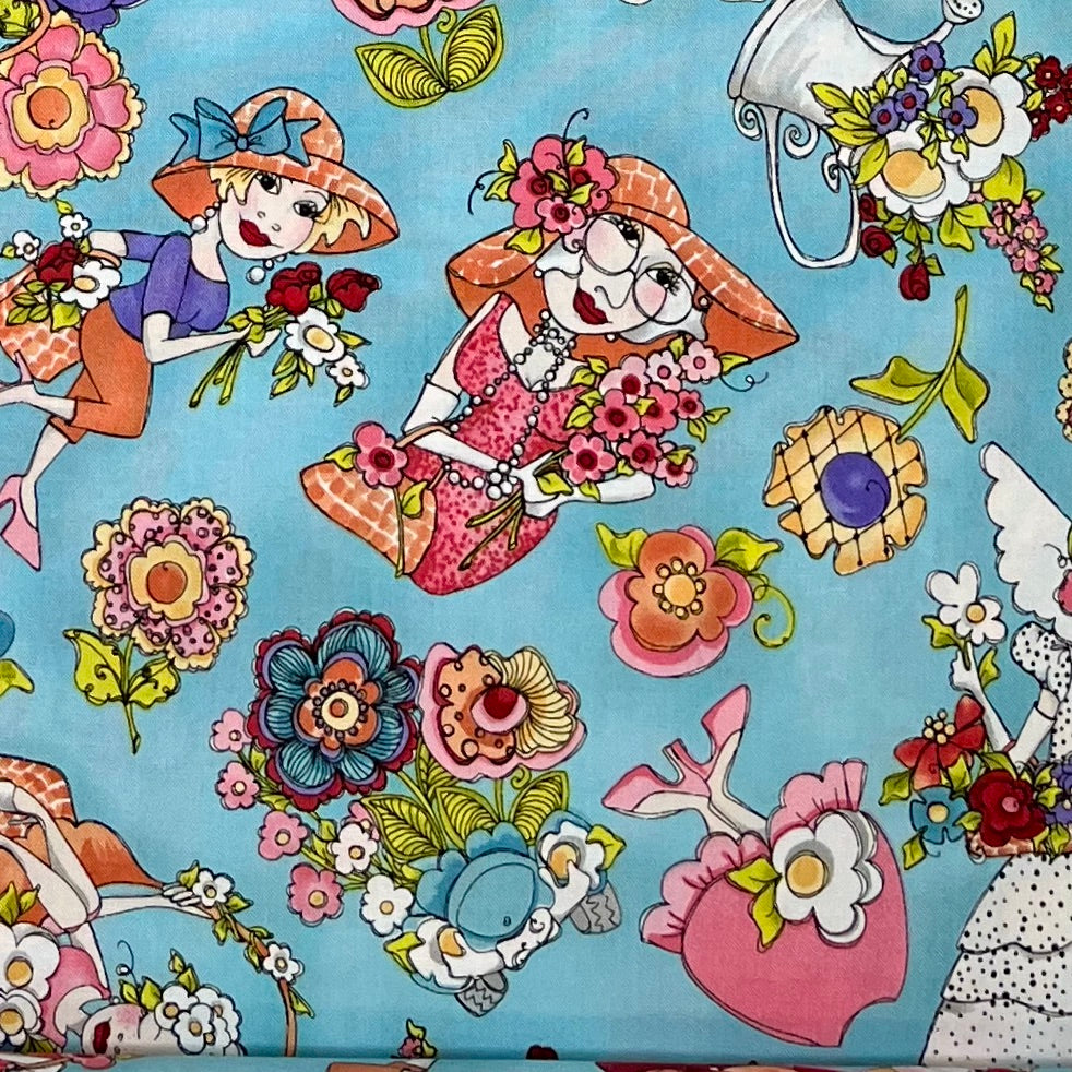 Gorgeous garden ladies pose & lounge on a solid turquoise background. Surrounded by funky creative florals, the lovely ladies boast in their wild fancy hats & ruffled dresses. Metal watering cans are filled to the brim with bushels of several types of flowers. Designed by Loralie Harris for Loralie Designs.