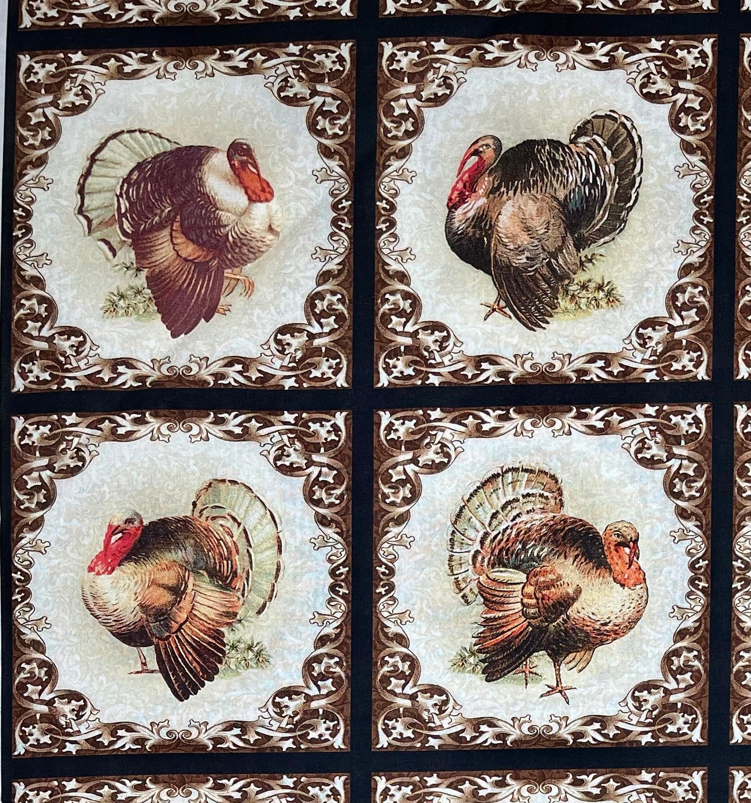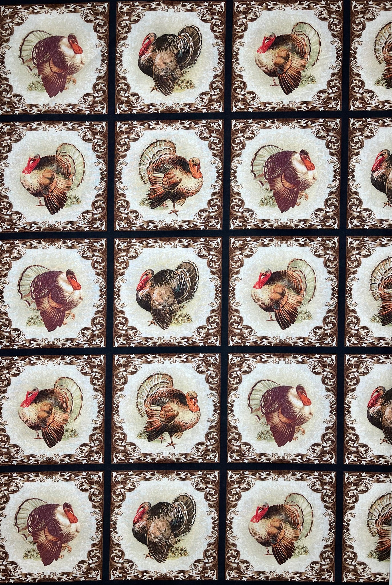 Rows of squares capture elegantly framed turkeys. These feathered friends flaunt their stunning colors & vintage style. Fluffing their beards proudly they'll bring an autumn flare to any Thanksgiving project or put a smile on a beloved turkey hunter's face. Designed by Skyline Studio for Benartex.