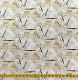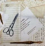Days long past of hand written letters and engraved invitations. Such romance. Hand written letters and engraved invitations to the ball, eyeglasses, magnifying glasses, envelopes and scissors are scattered and collaged together in tones of cream, sepia and brown. Designed by Danieile Murry for Blank Quilting Corp.