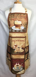 CAFE' au LAIT. Great vignettes of our favorite gourmet coffees are front and center. Luscious coffee colors make this perfect for both men and women. A finished apron, ready to use. Perfect for hosting a dinner or coffee club. Or just because you want to. Hand made with the finest 100% cotton fabric and quality workmanship. Fully lined with coordinating fabric, for durability and body. An elastic insert in the neck strap makes it easy to pull over the head, flexes with movements and generally fits any size. Two large pockets flank each side. A large towel loop on the right pocket is handy for many uses. This apron is made in a XXL size to fit almost anyone. Apron hand made by Donette Backlund. Machine wash and dry. Iron is desired.