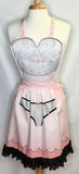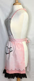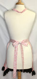 OOH LA LA ! What a fun and playful apron. Great to  have around for that special occasion, a perfect bridal shower gift or a birthday gift for a friend. Hand made with the finest 100% cotton fabric and quality workmanship. Custom embroidery on the bodice front of the apron. Bodice is fully lined with coordinating fabric. Gathered skirt has a sexy fringe of black eyelet lace on the bottom An elastic insert in the neck strap makes it easy to pull over the head, flexes with movements and generally fits any size. This apron is made in a average size to fit almost anyone. Apron hand made by Donette Backlund. Machine wash and dry. Iron is desired.