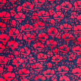 Deep red morning glory like flowers are grouped on a navy background. The contrast is quite striking and very strong. This would be a great feature fabric. Hand-dyed original Island Batik design.