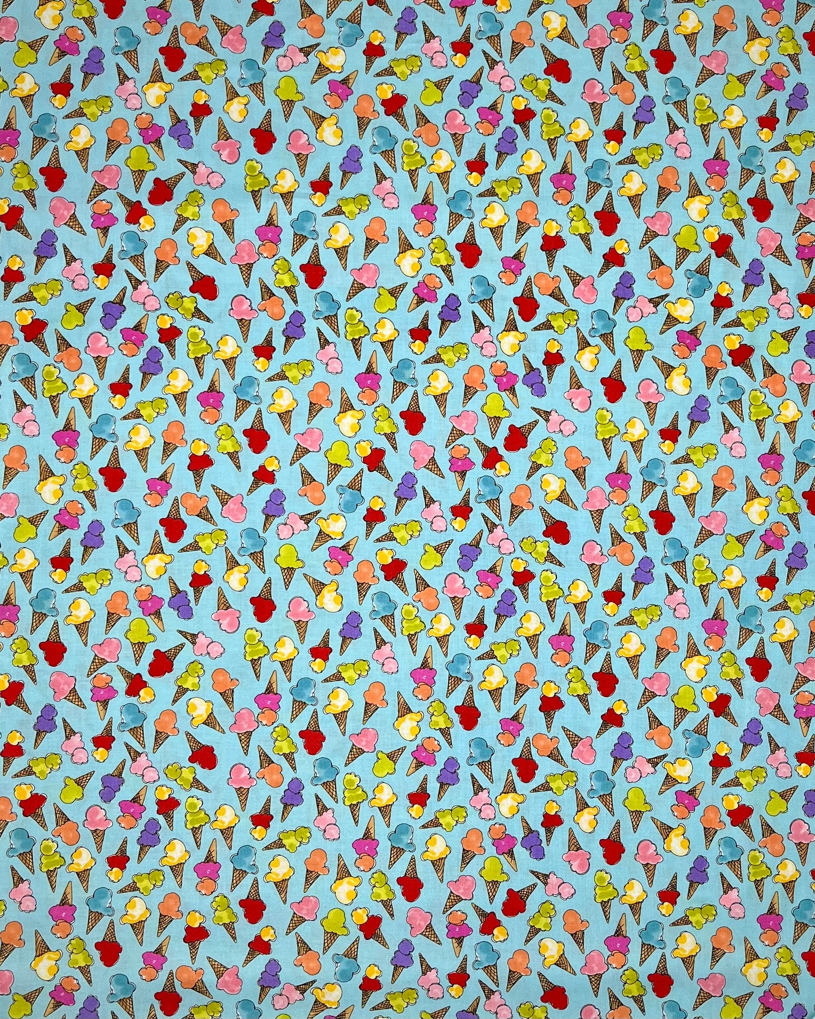 You scream! We scream! For none other than ice cream! These fun colorful cones are being served up, one or two scoops? Scattered across a light turquoise background. This eclectic fabric is perfect for anyone with a raging ice cream addiction! Designed by Loralie Harris for Loralie Designs.