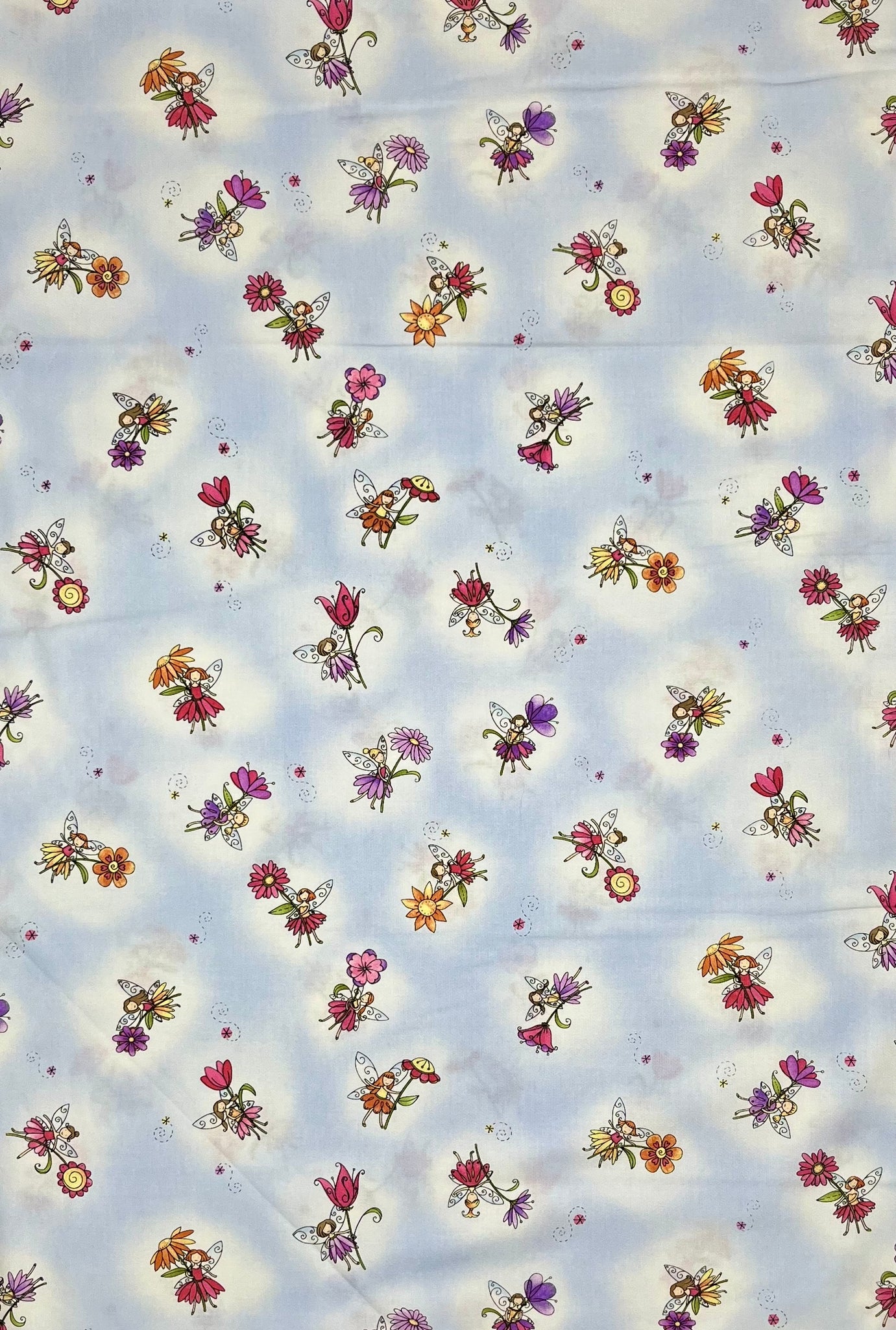 Sweet tiny fairies dressed in vibrant petal dresses dance in the breeze showing off their flower umbrellas. This fabric would be darling to create a skirt for the little fairy in your life! Designed by Moon Cookie Gallery for In The Beginning Fabrics.
