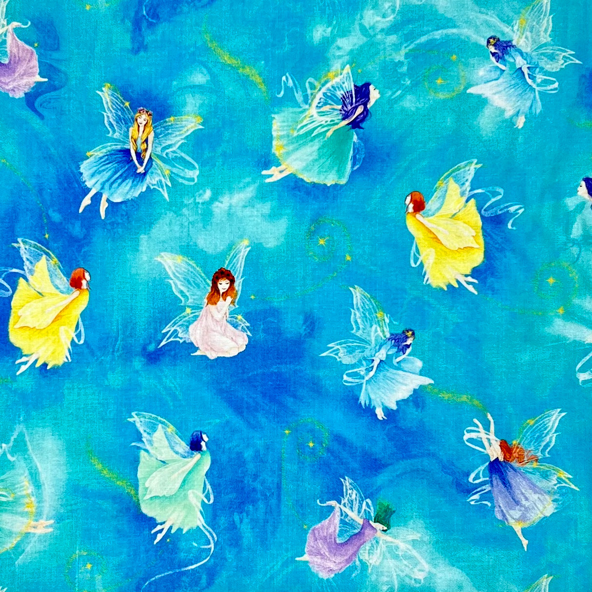 Darling fairies soar and twirl sharing their magic across a fantasy sky of deep blue and aqua. Pretty delicate pastel shades adorn their flowing dresses. Designed by Chong A Hwango for Timeless Treasures.