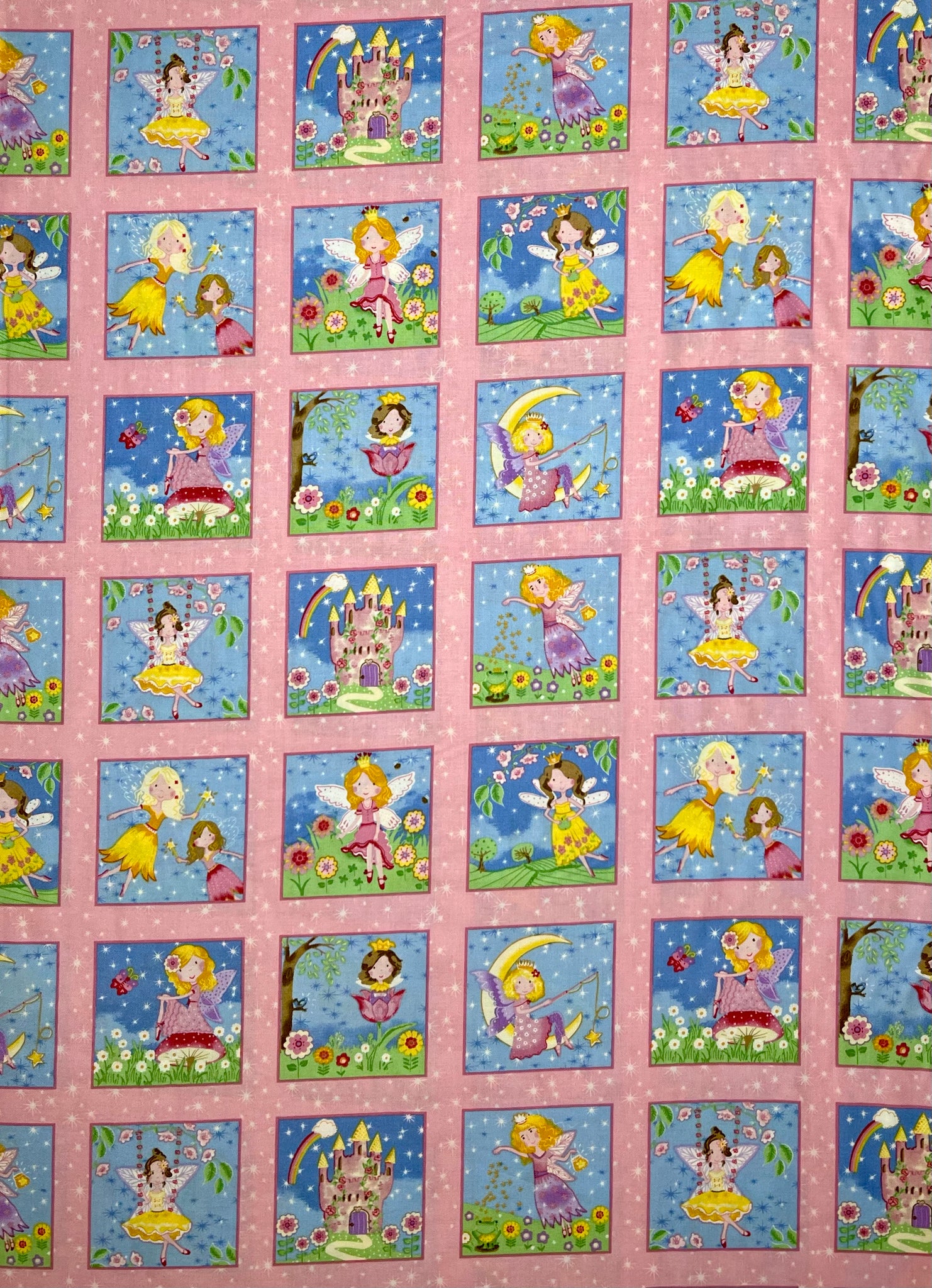 Adorable pixies perch and pose with friends in dainty square frames, a lovely baby pink background is bedazzled with sparkles. The sweet sprites frolic in flourishing flower fields atop mushrooms, swings and play hide and seek in the tulips. Some of the frames illustrate the fairies sitting upon the crescent moon, others possess little wands or sprinkle fairy dust onto handsome frogs. Designed by The Henley Studio for Makower UK.