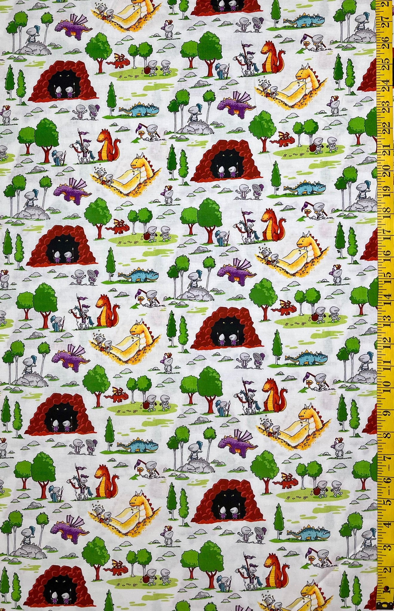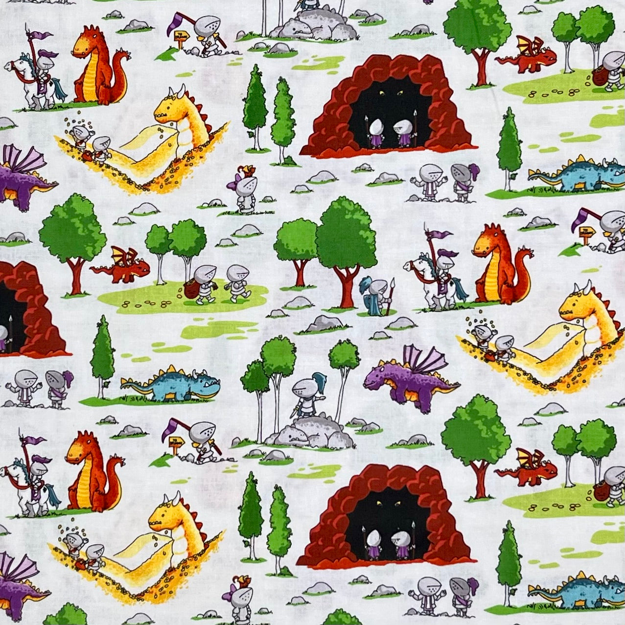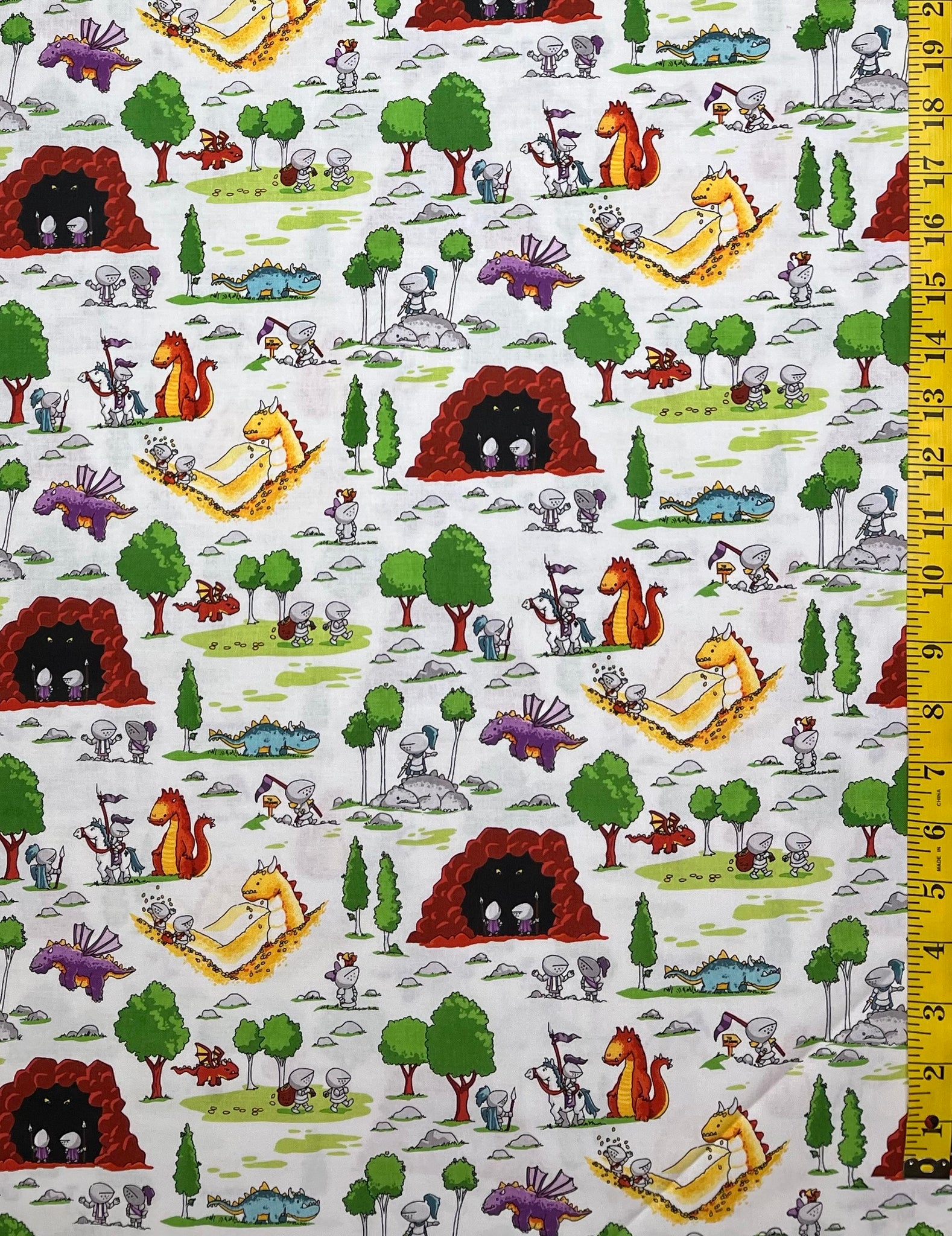 Humorous & curious little knights courageously travel great lengths in search of colorful dragons. As brave and adventurous these wee knights are they unfortunately find themselves in comical situations with these gentle giants. This charming fabric is perfect for any little gallant adventure in your life. Directional print on a white background. Designed by Ben Byrd for Riley Blake Designs.