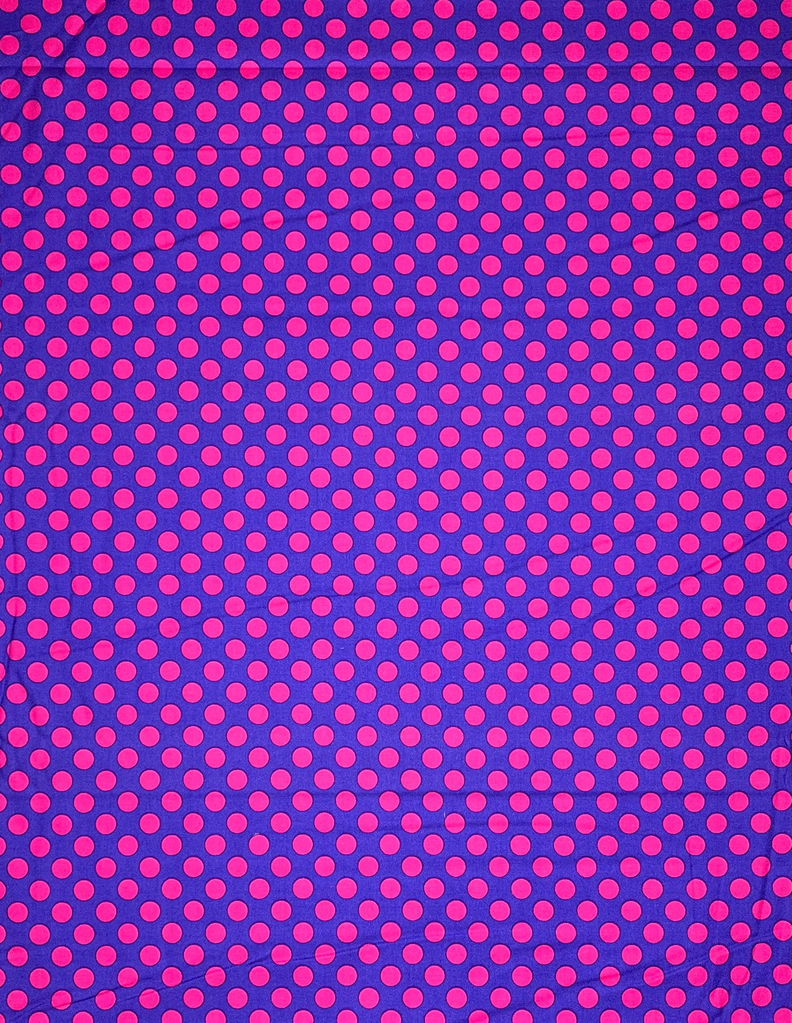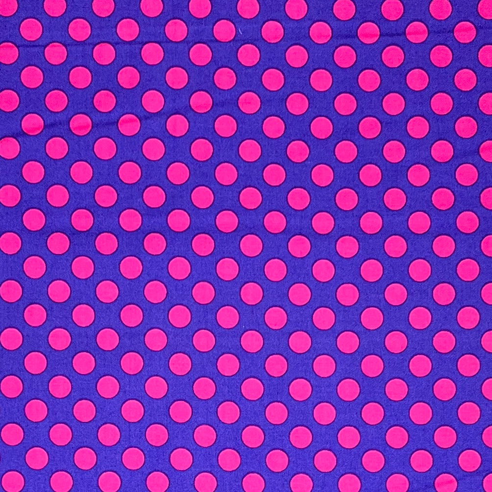 A deep rich purple background is popping up with hot pink polka dots. An exceptionally vibrant and eye catching fabric. Produced by Michael Miller Fabrics.