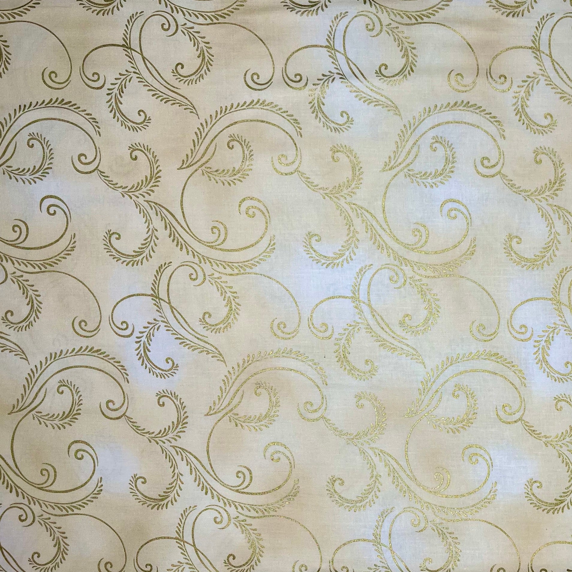 Looking for a classy, simple & elegant blender? You've come to the right place! Golden metallic swirls travel gracefully across this light creamy yellow background. Each swirl glistens in the light when the fabric is moved. A fabulous blender for a quilt backing or grand curtains.