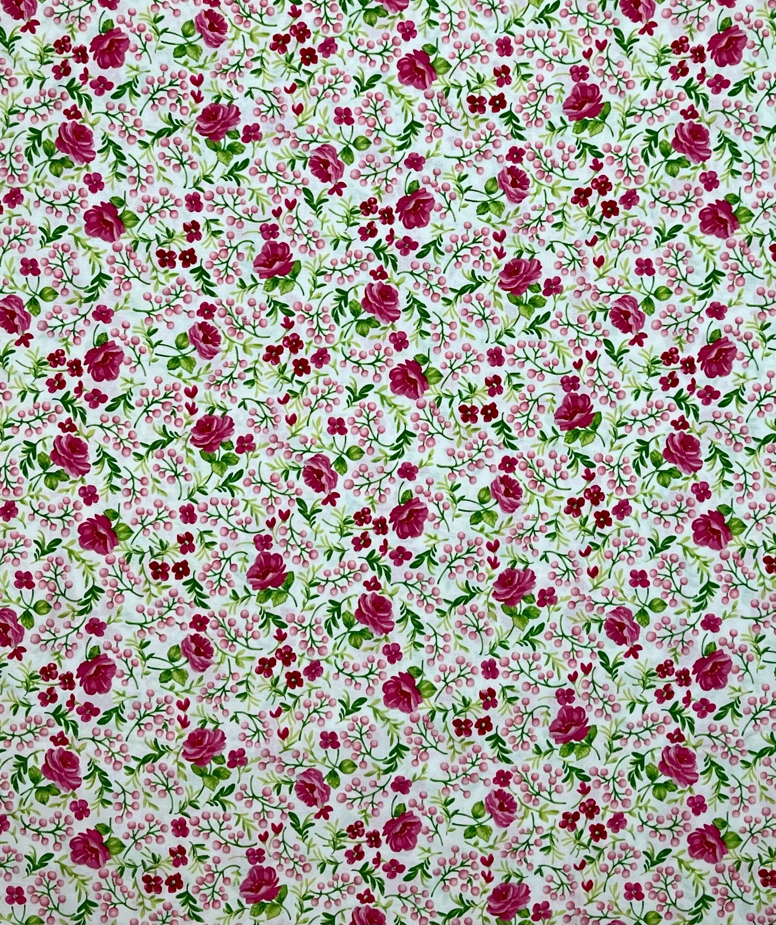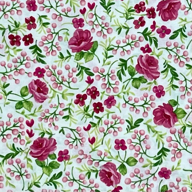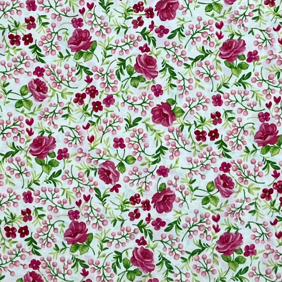 Darling & dainty florals sprawl and cover this fabric. Bundles of pink flowers & buds paint a masterful bouquet against a white background. A sweet fabric to use for a skirt or pair with matching colors. Designed by Skipping Stones Studio for Clothworks.