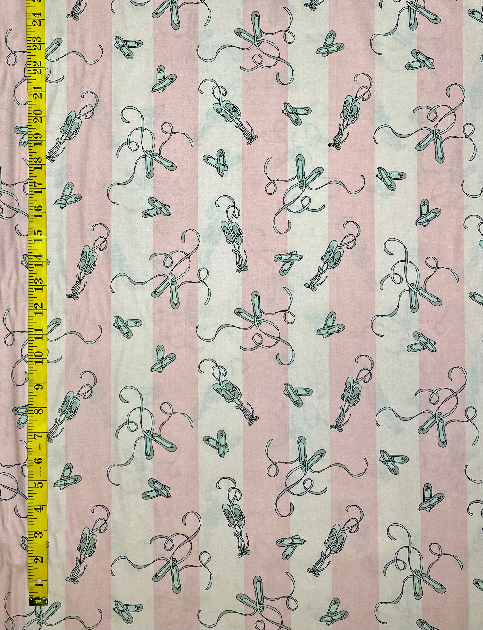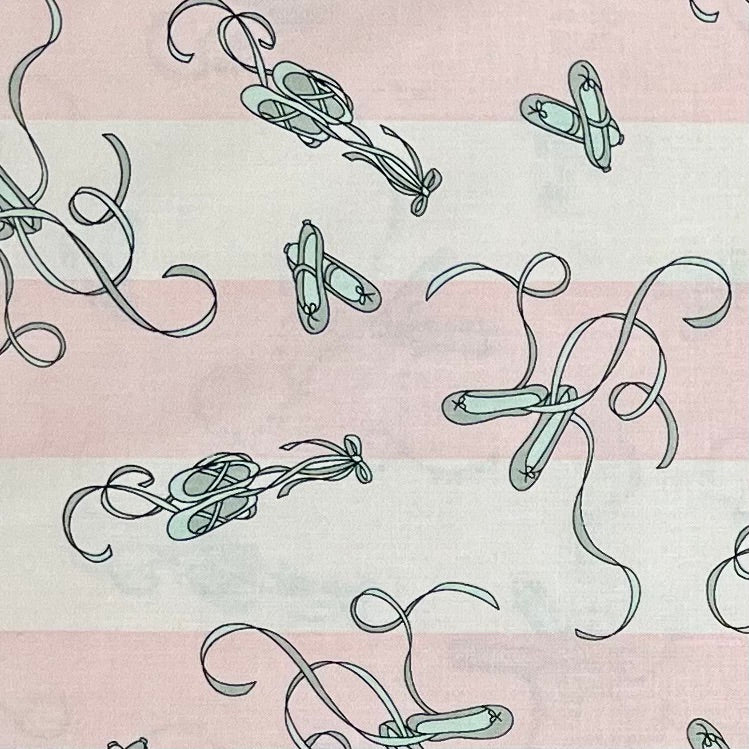 Grey ballet slippers twirl across a large pink striped background. Ribbons twist & whirl in neatly tied up bows. Designed by Jill Finley for Henry Glass & Co.