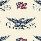 This patriotic fabric designed by Whistler Studios for Windham Fabrics contains row of American Eagles alternated with USA flags on a cream background.