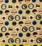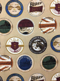 Masculine colored beer labels are lined up on a tan background. This is a directional print. Designed by Maria Kalinowski for Kanvas Studio - Benartex Fabrics.