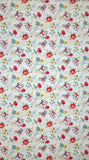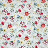 A variety of warm tone flowers are paired with blue floral clusters. They lay scattered across a light cream background. The petals resemble charming brush strokes, a nod to the fabric name. Designed by Lisa Audit for Wilmington Prints.