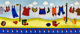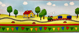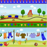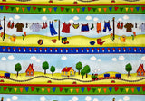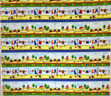 Bright and happy colors for this Little one's world. Cute little clothes hanging on the line and various toys scattered about. An old fashioned train chugs along a windy track across the countryside dotted with cute little houses and trees. This border print is perfect for a project for the little ones in your life. It would make a great border on a quilt, darling as a diaper bag, or cut up into blocks for an "I Spy" throw. Lots of possibilities. Made by Stof of Denmark.