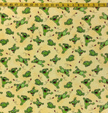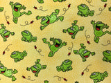 What's more fun and happy frogs leaping ion the air and chasing ladybugs. Exuberant green frogs on a pale yellow background. This print is directional. This Comfy flannel is 100% Cotton, top quality quilting grade, 44/45" wide made by AE Nathan Co.