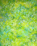 Soft lime green hand dyed background is stamped with blue/gray branches interspersed with flower bursts and flowers. Overall it gives the impression of a Monet water color. Original Island Batik design.