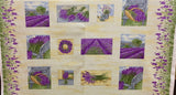 Panel repeat is 24" x 42" horizontal orientation. Vignette scenes from a lavender field are set in compatible squares & rectangles. Beautiful shades of purple with green & gold accents are set on a striated, tone on tone, soft yellow background. Selvage edge of fabric is bordered with rows of lavender & greenery. By Firetrail Designs for Andover Fabrics Inc.
