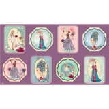 Beautiful "Steam Punk" girls portraits. Each in a shaped frame unique to the girl. Colors are soft but clear. Eight portraits in 2 rows are set on an orchard purple background. Easy to fussy cut for use as blocks in a quilt or on the side of a bag or book cover, or use whole as the center piece of a quilt. Portraits measure approximately 9 1/2" to 11" high and approximately 8" to 9 1/2" wide. Each one is slightly different. Designed by Santoro London for QT Fabrics.