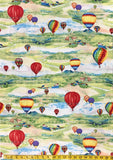 Up, up and away. Floating free over a hilly landscape, bright multi colored balloons take flight. By Mary Jo Hull of Whistler Studios for Windham Fabrics.